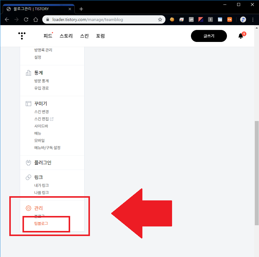 티스토리 관리-> 팀 블로그로 들어갑니다.